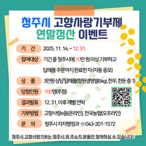 [충청뉴스라인 김대균 기자] 충북 청주시가 연말정산 시즌을 맞아 고향사랑기부제 참여자에게 추가 혜택을 제공하는 특별 이벤트를 실시한다고 25일 밝혔다.시는 25일 12월 말까지 청주시에 10만 원 이상 기부한 사람을 대상으로 답례품 추가 증정 이벤트를 진행한다.기부자가 고향사랑기부를 완료한 뒤 답례품을 신청하면 자동으로 응모되며, 시는 추첨을 통해 100명을 선정해 3만 원 상당의 청주시 인기 답례품을 추가 제공할 계획이다.추가 증정으로는 ▶청원생명쌀 5㎏ ▶불고기용 한우 ▶한돈 삼겹살·목살 세트 중 하나로 구성됐다.고향사랑기부제는