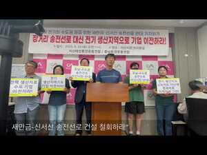 [충청뉴스라인 방관식 기자] 서산태안환경운동연합과 충남환경운동연합이 23일 오전 11시 서산시청 브리핑룸에서 기자회견을 열고, 새만금-신서산 송전선로 건설의 철회를 촉구했다.지난 상반기부터 새만금-신서산 345kV 송전선로 건설을 위한 입지선정위원 구성과 주민설명회 등이 개최되고 있다. 이에 따라 송전선로가 지나가는 지역에서는 반대 여론이 확산 중이다.공주시의회는 지난 3월 7일 '새만금-신서산 송전선로' 설치반대 결의안을 채택했다. 22일 서천을 방문한 김태흠 지사도 송전선로 건설에 대한 반대입장을 밝혔다. 기자회견 참석자들은 “