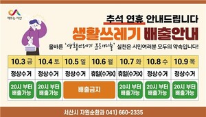 [충청뉴스라인 최인영 기자] 서산시가 추석 명절을 맞아 귀성객과 시민들이 쾌적하게 명절을 보낼 수 있도록 “추석 명절 쓰레기 관리 대책”을 10월 10일까지 추진한다.시에 따르면 관리 대책으로 추진되는 사항은 ▲추석맞이 국토 대청소 ▲추석 연휴 생활 쓰레기 수거 및 일정 안내 ▲환경종합상황실·기동처리반 운영 등이다.먼지, 시는 추석 명절 전 깨끗한 도시 환경을 조성하기 위해 10월 2일까지 공직자, 지역사회 기관·단체와 함께 관내 전 지역을 청소하는 ‘추석맞이 국토 대청소’를 추진한다.이번 대청소는 귀성객에게 쾌적한 귀성길과 생활
