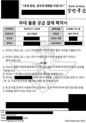 [충청뉴스라인 방관식 기자] 최근 당진에서 군 간부를 사칭한 범죄 시도가 잇따르고 있다.17일 당진시에 따르면 일부 철물점을 대상으로 지역 군부대 간부를 사칭해 대금을 지급하기로 약속하고, 물품 수령을 요구하는 사기 범죄 시도가 발생했다. 현재까지 확인된 피해는 없지만, 16일과 17일 철물점 2곳에 대금 지급을 약속하고 드릴 공구 세트 등 약 100만 원 상당의 물품을 요청한 사례가 확인됐다.군 간부를 사칭한 신원미상자는 ‘부대 물품 공급 결제 확약서’, ‘25년도 부대정비 소모품 구매 승인’ 명칭의 가짜 공문을 제시했다. 공문에