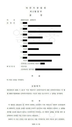 [충청뉴스라인 방관식 기자] 대전지방법원이 16일 예천지구 공영주차장 및 초록광장 조성 사업에 대한 집행정지 신청을 기각했다.이와 관련해 서산시는 17일 다시 한번 법적 정당성을 인정받았다고 밝혔다. 이번 법원의 판결이 지난 2월 감사원의 공익감사 종결과 7월 충청남도 주민감사 청구 각하에 이은 세 번째 판단으로, 사업의 필요성과 적법성을 명확히 입증하는 계기가 되었다는 것이다. 시에 따르면 법원은 결정문에서 "처분의 집행을 정지할 경우 공공복리에 중대한 미칠 우려가 있다"고 판단했다. 또한 신청인들에게 "회복하기 어려운 손해가 발
