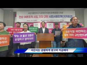 [충청뉴스라인 방관식 기자] 정의로운 서산시 행정을 촉구하는 시민모임(이하 시민모임)이 16일 서산시청 브링핑룸에서 기자회견을 열고 공정성 있는 보도를 촉구했다.시민모임은 “A기자단 일부 기자들이 예천지구 공영주차장(초록광장) 조성 사업과 관련해 유리한 언론을 조성하려 했다”고 주장했다.주장의 근거로 단톡방 대화 내용을 제시한 시민모임은 ▲관련자들의 사과 ▲재발 방지를 위한 공정 보도 협약 체결 ▲한국기자협회·언론중재위원회의 조사 등을 촉구했다.